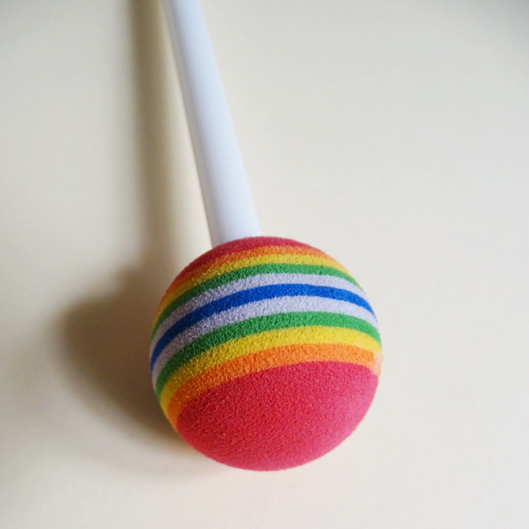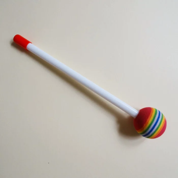 El extremo de la baqueta es una esfera grande, blandita y colorida, lo que ayuda a la coordinación óculo-manual cuando son más pequeños.