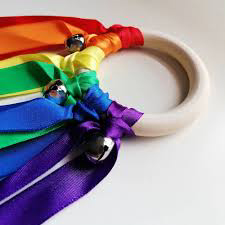 Compuestas por un aro de madera natural sin barnices, pensado para ser mordido y manipulado con seguridad, cintas de raso antimanchas de vivos colores que fluyen con el movimiento, y pequeños cascabeles que aportan una dimensión sonora muy atractiva para los más pequeños.